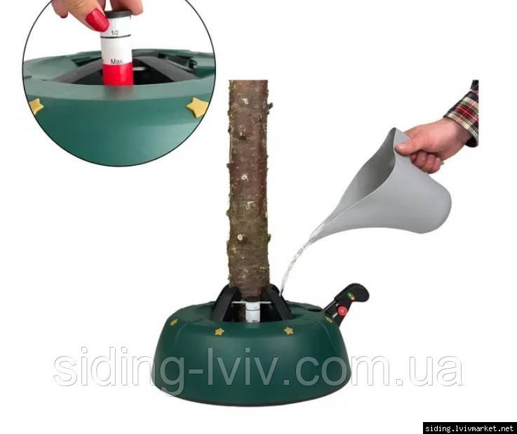 Контейнер для води об’ємом 2,5–6,3 л забезпечує оптимальне зволоження стовбура, що дозволяє дереву зберігати природний колір і свіжість протягом усього зимового періоду. І запатентована система 4 автоматичних гаків гарантує точну фіксацію стовбура незалежно від його форми.