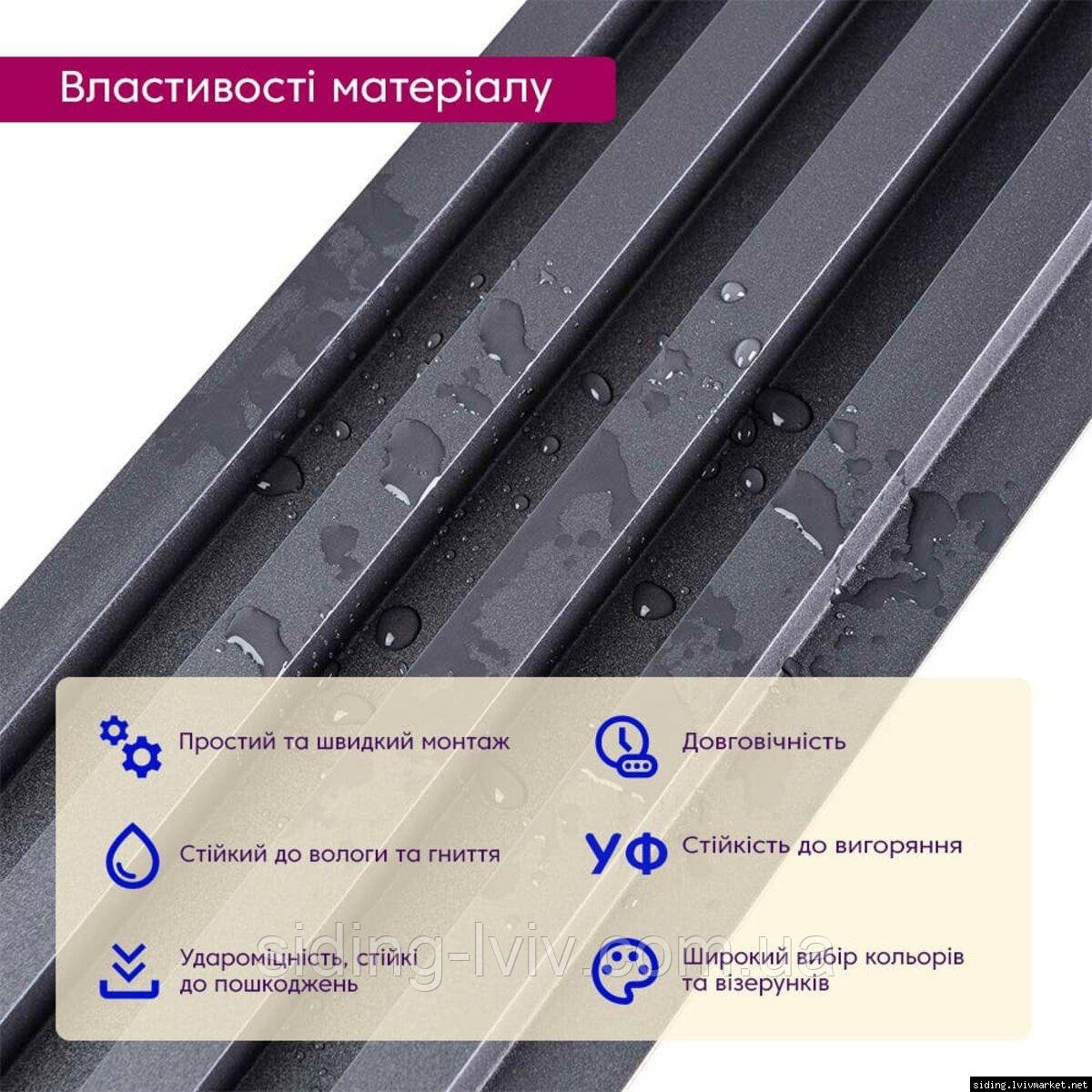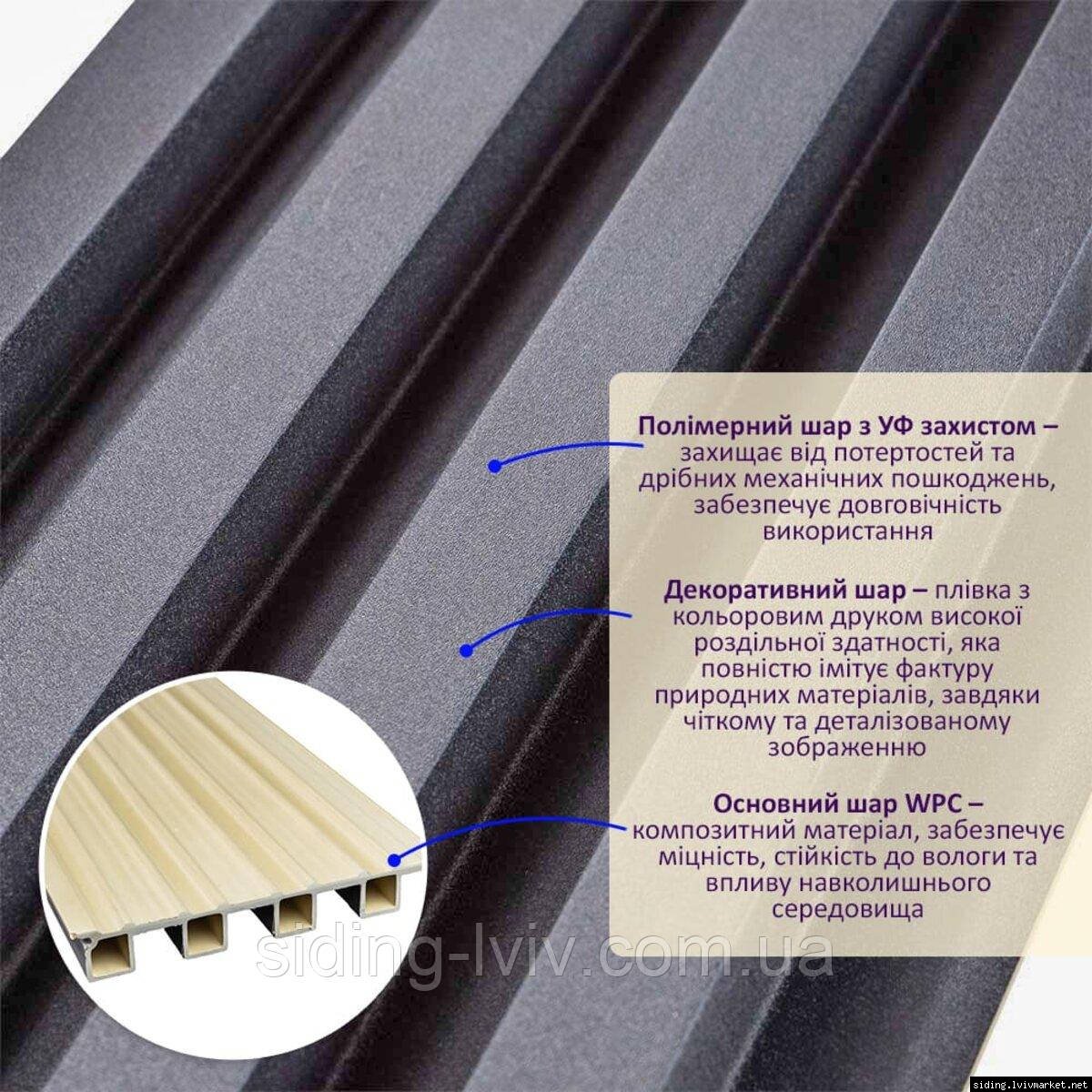 • Стійкість до впливу ультрафіолету: стінові панелі WPC зберігають свій колір та структуру під впливом ультрафіолетового випромінювання.