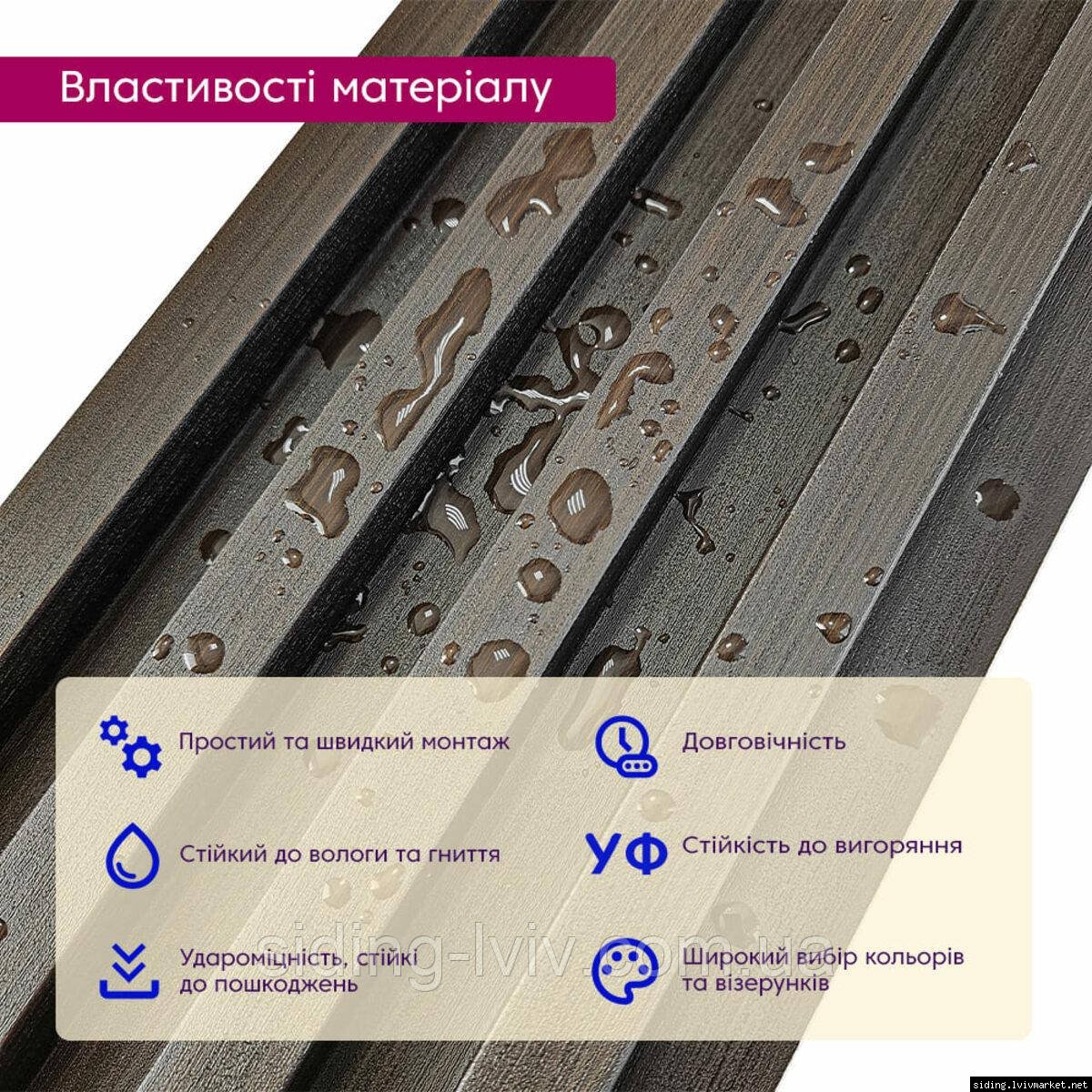 • Стійкість до вологи: матеріал WPC має високу стійкість до впливу вологи, не набухає і не деформується.