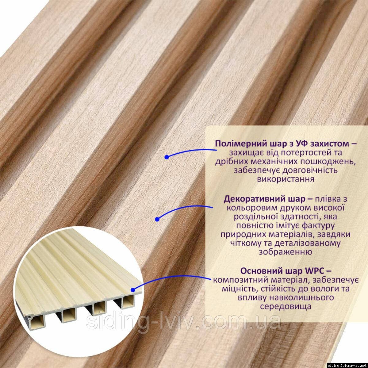 Опис: Стінові рейки WPC – будівельний матеріал для внутрішнього оздоблення, що імітує натуральну деревину.